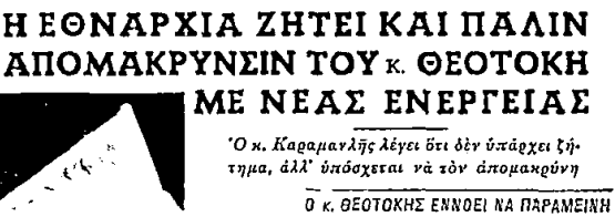 1956. Στη Λευκωσία Καννιβαλισμοί των Τούρκων κατά των Ελλήνων. Οι Τουρκοκύρπιοι εβαλαν φωτιά σε 9 ελληνικά καταστήματα και ανατίναξαν με βόμβα ελληνικό καπνεργοστάσιο. Η Εθναρχία ζήτησε από τον Κων. Καραμανλή την αντικατάσταση του υπουργού Εξωτερικών Κωνσταντίνου Θεοτόκη ως επιβλαβή στην κυπριακή υπόθεση.