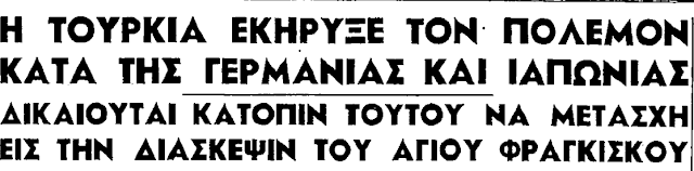 23 Φεβρουαρίου 1945 η ουδέτερη Τουρκία μπήκε στον Πόλεμο μετά από αγγλική υπόδειξη και κήρυξε τον Πόλεμο στην Γερμανία . Οι Άγγλοι πράκτορες των Αθηνών πανηγυριζαν διότι Στάλιν και Τίτο δεν υποστηριξαν την Εαμική Επανάσταση