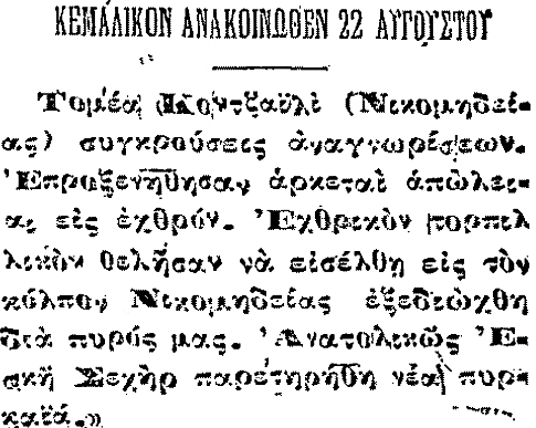 Οι Πέντε, ανέμεναν τα Νέα του Στεργιάδη για την Αυτονομία της Σμύρνης και δξμοσίευαν στις εφημερίδες μετά από εβδομάδες σπιωπής πολεμικό Ανακοινωθέν του Χατζηανέστη της 11ης/24ης Αυγούστου αλλά και Ανακοινωθέν του Κεμάλ της 9ης/22ας Αυγούστου που επιβεβαίωνε ότι γινόντουσαν αψιμαχίες.